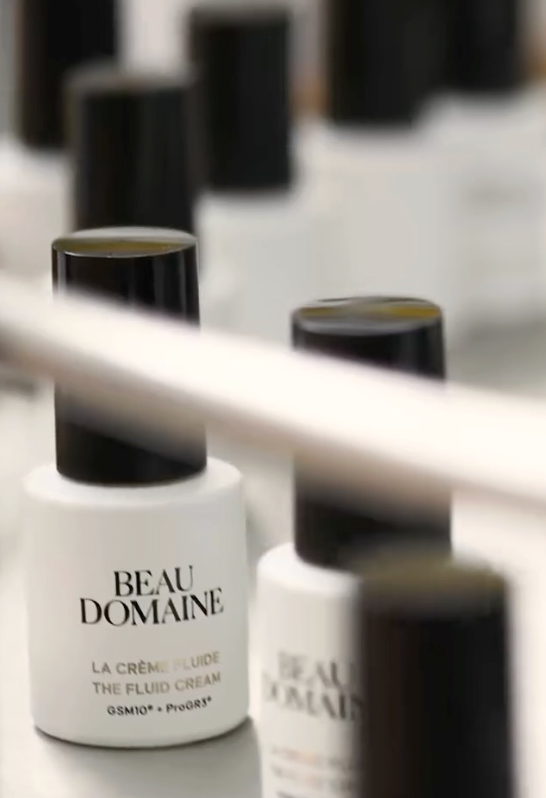 • Three 'Beau Domaine' skincare bottles with wooden caps on a light gray background
