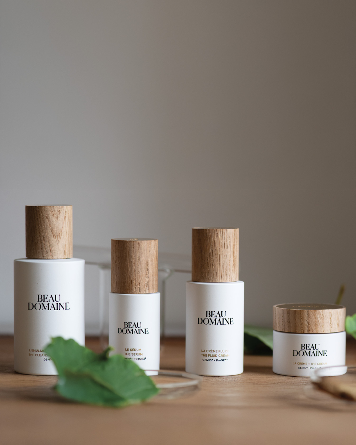 • Four BEAU DOMAINE skincare products with wooden caps on a light gray background