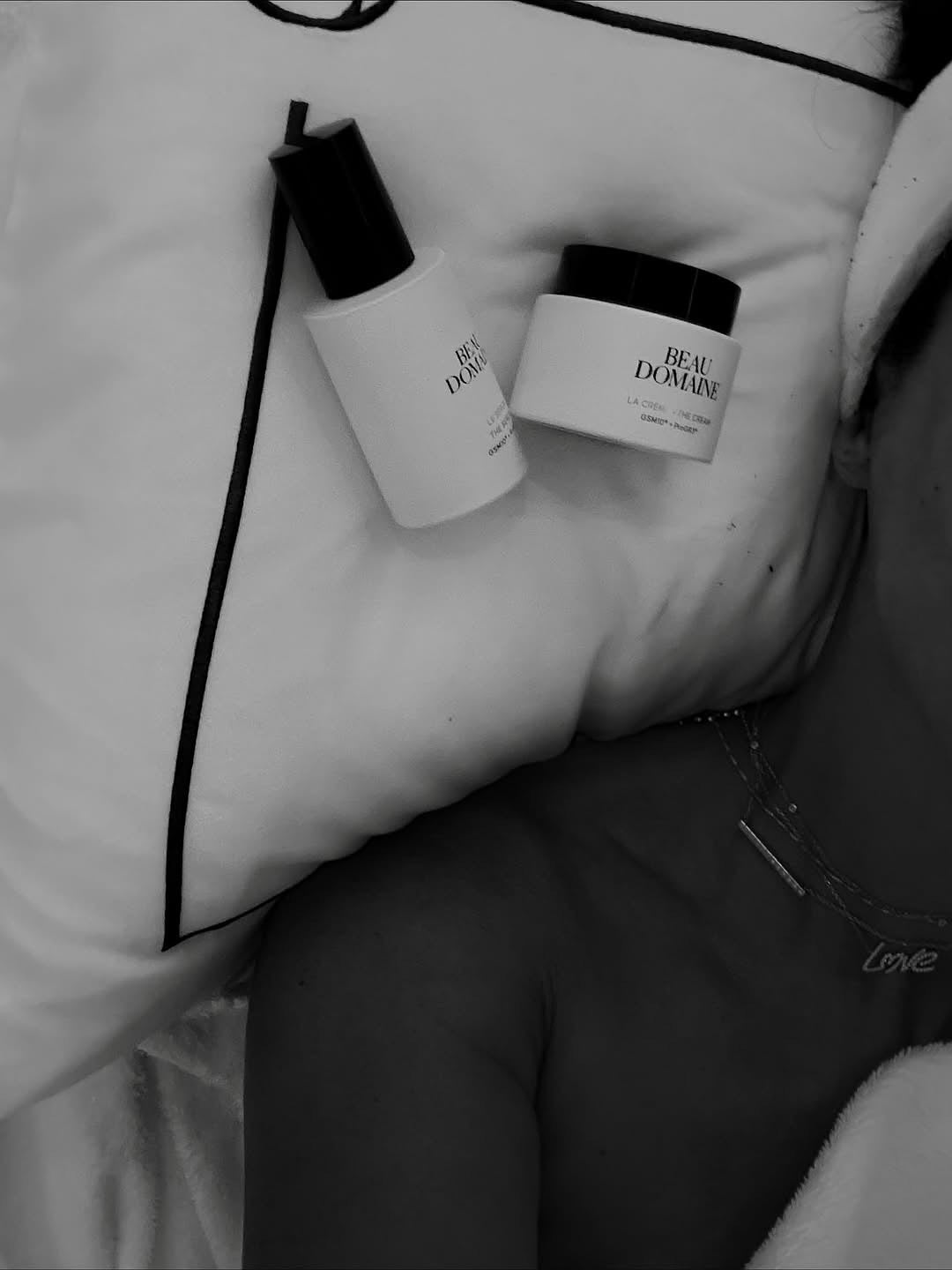 • Cosmetic set with bottles and a jar in front of a 'Beau Domaine' pouch on a light gray background