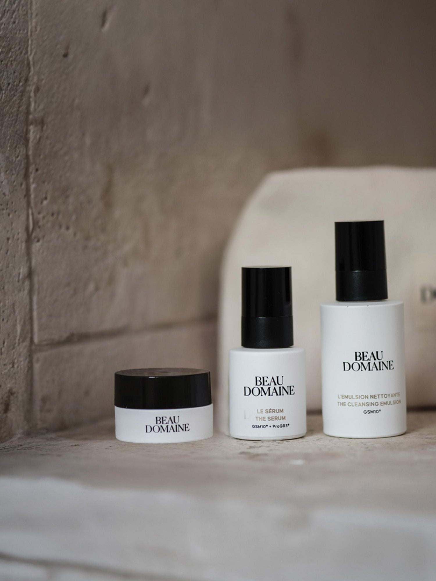 If you want to discover our products this is your go to routine to start looking after your skin: 3 simple steps in 3 mini formats: gently cleanse, boost, and hydrate your skin. (Ideal also for the travelers or on the go skincare). This includes The Cleansing Emulsion (30ml), The Serum (15ml), The Cream or The Fluid Cream (15ml) – based on your skin type and The Beau Domaine Pouch – Beau Domaine anytime, anywhere